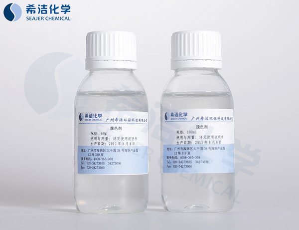 脫色劑是集脫色、絮凝、分離等多種功能于一身的有機分子合物,該產(chǎn)品特有的陽離子基團與廢水著色物質(zhì)的陰離子基團相互作用而成為難溶性鹽,用量小,脫色率,不再回色。對廢水的脫色率大于95%,COD的去除率在50%~70%之間,達到雙重功!